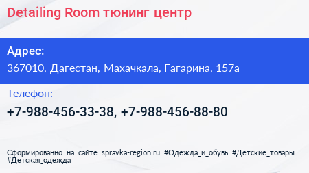 Detailing Room, тюнинг центр по адресу 367010, Дагестан, Махачкала, Гагарина, 157а в дальнейшем Организация, размещена в следующих категориях:
