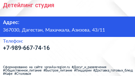 Детейлинг студия по адресу 367030, Дагестан, Махачкала, Азизова, 43/11 в дальнейшем Организация, размещена в следующих категориях: