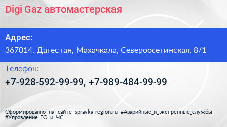 Digi Gaz, автомастерская по адресу 367014, Дагестан, Махачкала, Североосетинская, 8/1 в дальнейшем Организация, размещена в следующих категориях: