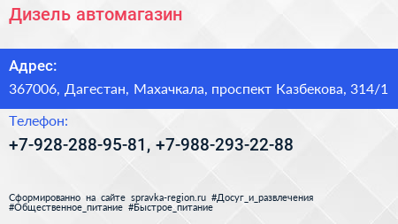 Дизель, автомагазин по адресу 367006, Дагестан, Махачкала, проспект Казбекова, 314/1 в дальнейшем Организация, размещена в следующих категориях: