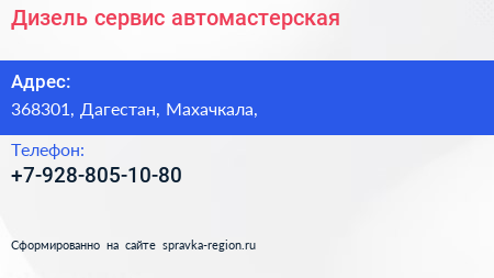 Дизель сервис, автомастерская по адресу 368301, Дагестан, Махачкала, в дальнейшем Организация, размещена в следующих категориях: