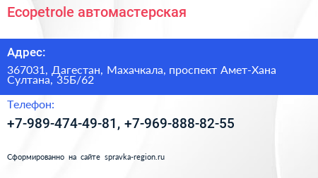 Ecopetrole, автомастерская по адресу 367031, Дагестан, Махачкала, проспект Амет-Хана Султана, 35Б/62 в дальнейшем Организация, размещена в следующих категориях: