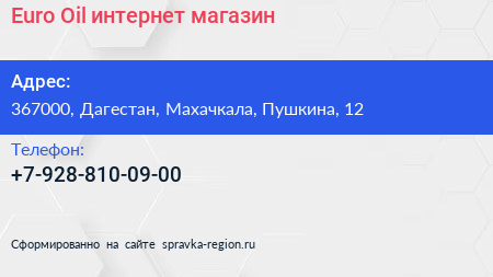 Euro Oil, интернет-магазин по адресу 367000, Дагестан, Махачкала, Пушкина, 12 в дальнейшем Организация, размещена в следующих категориях: