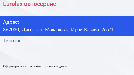 Eurolux, автосервис по адресу 367030, Дагестан, Махачкала, Ирчи Казака, 26в/1 в дальнейшем Организация, размещена в следующих категориях: