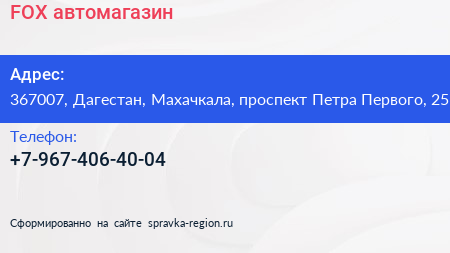 FOX, автомагазин по адресу 367007, Дагестан, Махачкала, проспект Петра Первого, 25 в дальнейшем Организация, размещена в следующих категориях: