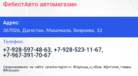 ФебестАвто, автомагазин по адресу 367026, Дагестан, Махачкала, Хизроева, 12 в дальнейшем Организация, размещена в следующих категориях: