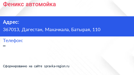 Феникс, автомойка по адресу 367013, Дагестан, Махачкала, Батырая, 110 в дальнейшем Организация, размещена в следующих категориях: