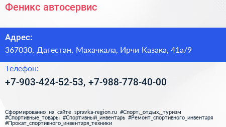 Феникс, автосервис по адресу 367030, Дагестан, Махачкала, Ирчи Казака, 41а/9 в дальнейшем Организация, размещена в следующих категориях: