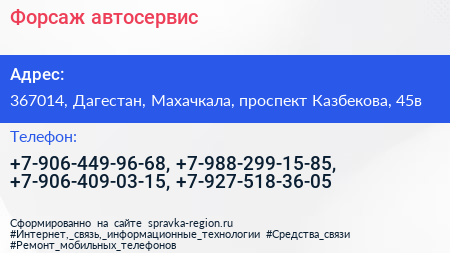 Форсаж, автосервис по адресу 367014, Дагестан, Махачкала, проспект Казбекова, 45в в дальнейшем Организация, размещена в следующих категориях: