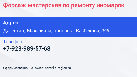 Форсаж, мастерская по ремонту иномарок по адресу Дагестан, Махачкала, проспект Казбекова, 349 в дальнейшем Организация, размещена в следующих категориях: