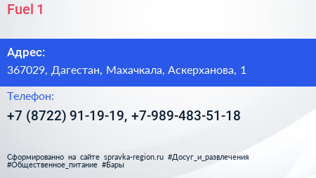Fuel 1 по адресу 367029, Дагестан, Махачкала, Аскерханова, 1 в дальнейшем Организация, размещена в следующих категориях: