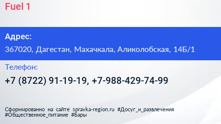 Fuel 1 по адресу 367020, Дагестан, Махачкала, Аликолобская, 14Б/1 в дальнейшем Организация, размещена в следующих категориях: