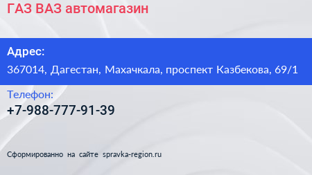 ГАЗ-ВАЗ, автомагазин по адресу 367014, Дагестан, Махачкала, проспект Казбекова, 69/1 в дальнейшем Организация, размещена в следующих категориях: