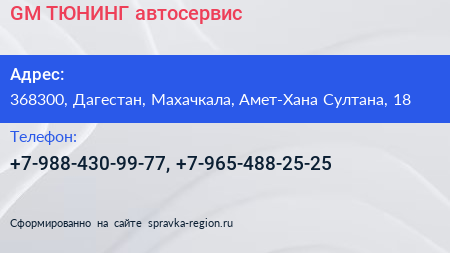 GM-ТЮНИНГ, автосервис по адресу 368300, Дагестан, Махачкала, Амет-Хана Султана, 18 в дальнейшем Организация, размещена в следующих категориях: