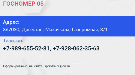 ГОСНОМЕР 05 по адресу 367030, Дагестан, Махачкала, Газпромная, 3/1 в дальнейшем Организация, размещена в следующих категориях: