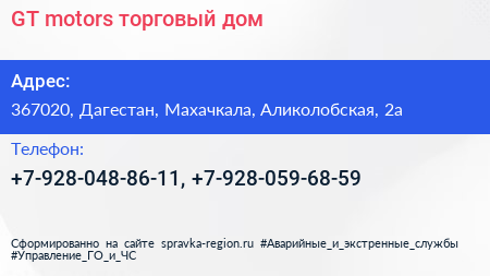 GT-motors, торговый дом по адресу 367020, Дагестан, Махачкала, Аликолобская, 2а в дальнейшем Организация, размещена в следующих категориях: