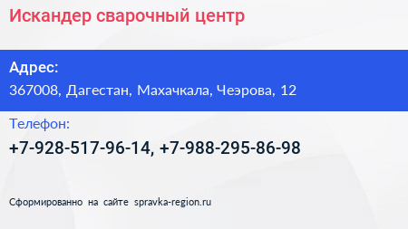 Искандер, сварочный центр по адресу 367008, Дагестан, Махачкала, Чеэрова, 12 в дальнейшем Организация, размещена в следующих категориях: