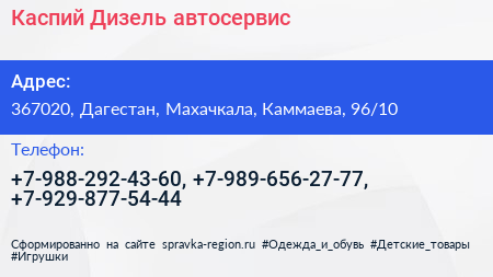 Каспий Дизель, автосервис по адресу 367020, Дагестан, Махачкала, Каммаева, 96/10 в дальнейшем Организация, размещена в следующих категориях: