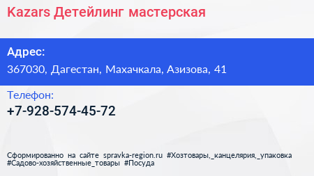 Kazars Детейлинг, мастерская по адресу 367030, Дагестан, Махачкала, Азизова, 41 в дальнейшем Организация, размещена в следующих категориях: