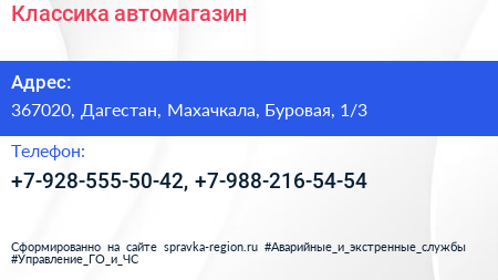 Классика, автомагазин по адресу 367020, Дагестан, Махачкала, Буровая, 1/3 в дальнейшем Организация, размещена в следующих категориях: