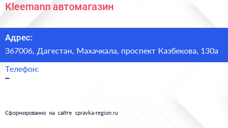 Kleemann, автомагазин по адресу 367006, Дагестан, Махачкала, проспект Казбекова, 130а в дальнейшем Организация, размещена в следующих категориях: