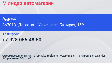 М-лидер, автомагазин по адресу 367013, Дагестан, Махачкала, Батырая, 159 в дальнейшем Организация, размещена в следующих категориях: