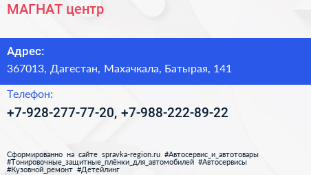 МАГНАТ, центр по адресу 367013, Дагестан, Махачкала, Батырая, 141 в дальнейшем Организация, размещена в следующих категориях: