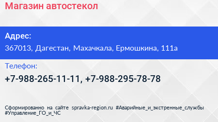 Магазин автостекол по адресу 367013, Дагестан, Махачкала, Ермошкина, 111а в дальнейшем Организация, размещена в следующих категориях: