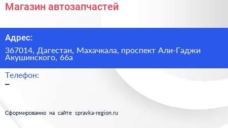 Магазин автозапчастей по адресу 367014, Дагестан, Махачкала, проспект Али-Гаджи Акушинского, 66а в дальнейшем Организация, размещена в следующих категориях: