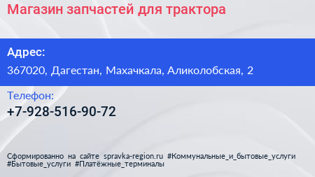 Магазин запчастей для трактора по адресу 367020, Дагестан, Махачкала, Аликолобская, 2 в дальнейшем Организация, размещена в следующих категориях: