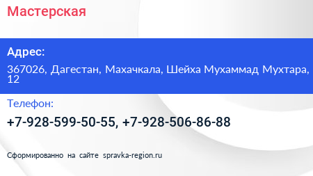 Мастерская по адресу 367026, Дагестан, Махачкала, Шейха Мухаммад Мухтара, 12 в дальнейшем Организация, размещена в следующих категориях: