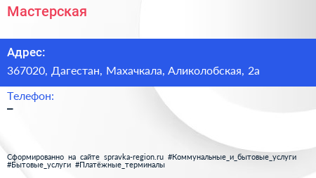 Мастерская по адресу 367020, Дагестан, Махачкала, Аликолобская, 2а в дальнейшем Организация, размещена в следующих категориях: