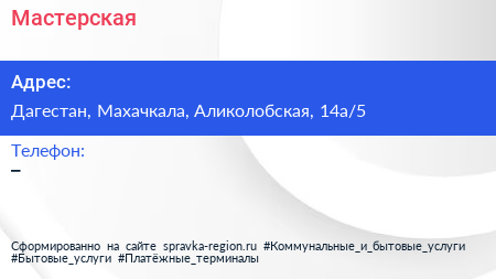 Мастерская по адресу Дагестан, Махачкала, Аликолобская, 14а/5 в дальнейшем Организация, размещена в следующих категориях: