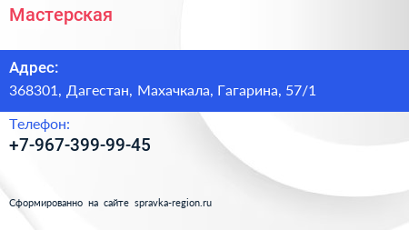 Мастерская по адресу 368301, Дагестан, Махачкала, Гагарина, 57/1 в дальнейшем Организация, размещена в следующих категориях: