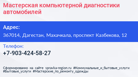 Мастерская компьютерной диагностики автомобилей по адресу 367014, Дагестан, Махачкала, проспект Казбекова, 12 в дальнейшем Организация, размещена в следующих категориях: