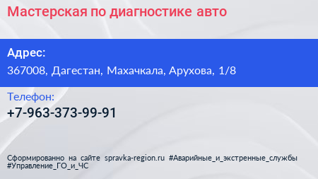 Мастерская по диагностике авто по адресу 367008, Дагестан, Махачкала, Арухова, 1/8 в дальнейшем Организация, размещена в следующих категориях: