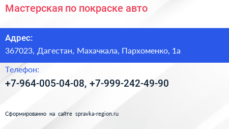 Мастерская по покраске авто по адресу 367023, Дагестан, Махачкала, Пархоменко, 1а в дальнейшем Организация, размещена в следующих категориях: