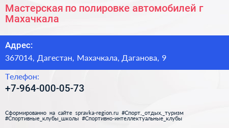 Мастерская по полировке автомобилей, г. Махачкала по адресу 367014, Дагестан, Махачкала, Даганова, 9 в дальнейшем Организация, размещена в следующих категориях:
