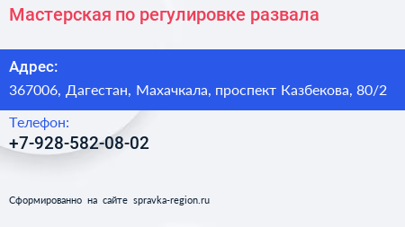 Мастерская по регулировке развала по адресу 367006, Дагестан, Махачкала, проспект Казбекова, 80/2 в дальнейшем Организация, размещена в следующих категориях: