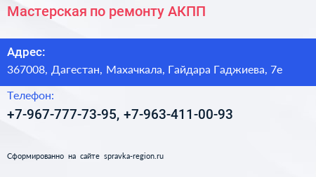 Мастерская по ремонту АКПП по адресу 367008, Дагестан, Махачкала, Гайдара Гаджиева, 7е в дальнейшем Организация, размещена в следующих категориях: