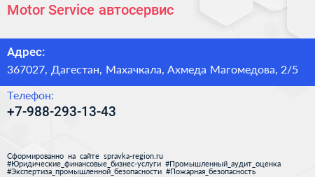 Motor Service, автосервис по адресу 367027, Дагестан, Махачкала, Ахмеда Магомедова, 2/5 в дальнейшем Организация, размещена в следующих категориях: