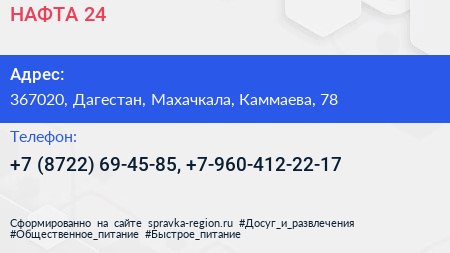 НАФТА 24 по адресу 367020, Дагестан, Махачкала, Каммаева, 78 в дальнейшем Организация, размещена в следующих категориях: