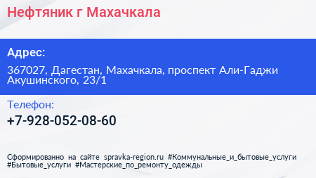 Нефтяник, г. Махачкала по адресу 367027, Дагестан, Махачкала, проспект Али-Гаджи Акушинского, 23/1 в дальнейшем Организация, размещена в следующих категориях: