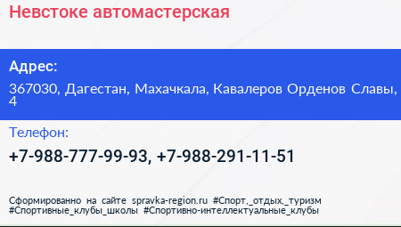 Невстоке, автомастерская по адресу 367030, Дагестан, Махачкала, Кавалеров Орденов Славы, 4 в дальнейшем Организация, размещена в следующих категориях: