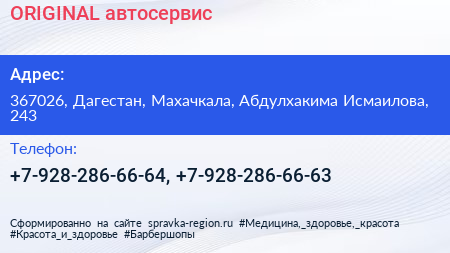 ORIGINAL, автосервис по адресу 367026, Дагестан, Махачкала, Абдулхакима Исмаилова, 243 в дальнейшем Организация, размещена в следующих категориях: