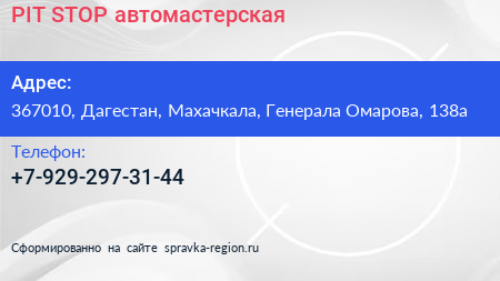 PIT STOP, автомастерская по адресу 367010, Дагестан, Махачкала, Генерала Омарова, 138а в дальнейшем Организация, размещена в следующих категориях: