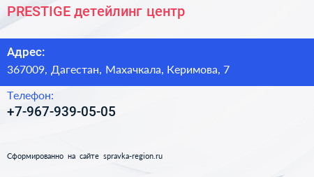 PRESTIGE, детейлинг центр по адресу 367009, Дагестан, Махачкала, Керимова, 7 в дальнейшем Организация, размещена в следующих категориях: