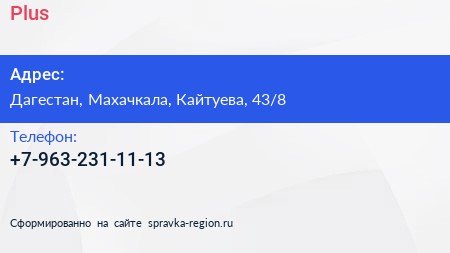 Plus по адресу Дагестан, Махачкала, Кайтуева, 43/8 в дальнейшем Организация, размещена в следующих категориях: