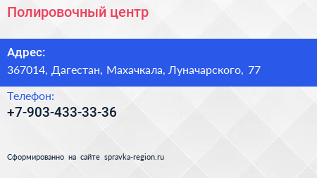 Полировочный центр по адресу 367014, Дагестан, Махачкала, Луначарского, 77 в дальнейшем Организация, размещена в следующих категориях: