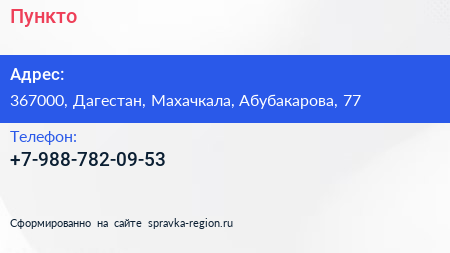 Пункто по адресу 367000, Дагестан, Махачкала, Абубакарова, 77 в дальнейшем Организация, размещена в следующих категориях: